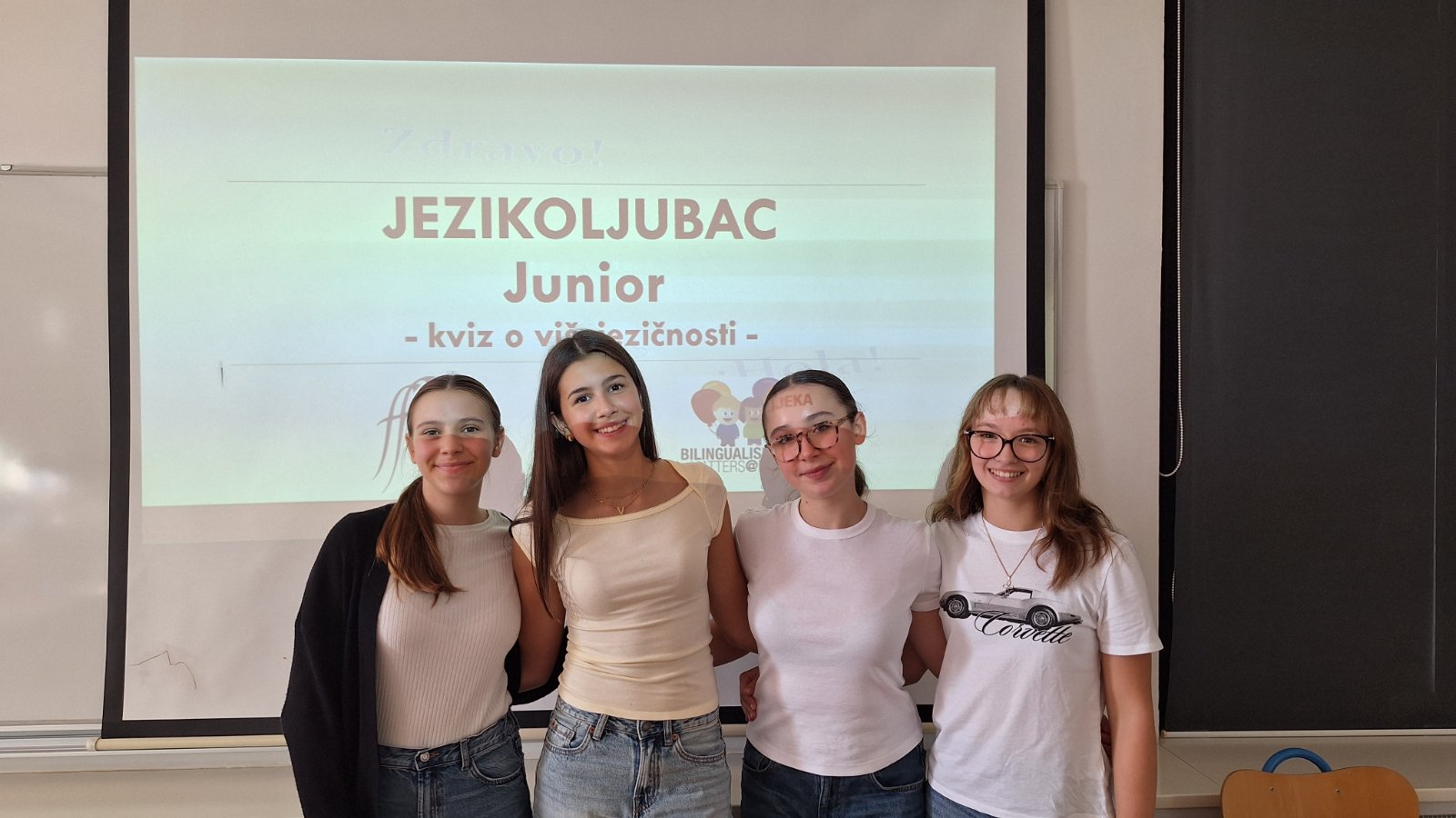 In occasione della Giornata europea delle lingue, che si celebra ogni anno il 26 settembre, le nostre alunne della classe 8ª A – Marta Kovačić, Viktoria Mance, Kaja Nikolić e Paola Mičić – accompagnate dalla professoressa di lingua tedesca Ingrid Baričević, hanno partecipato al quiz “JEZIKOLJUBAC JUNIOR”, organizzato da Bilingualism Matters@Rijeka, sezione dell’organizzazione non profit Bilingualism Matters con sede a Edimburgo, nel Regno Unito, che opera presso la Facoltà di Filosofia di Fiume.